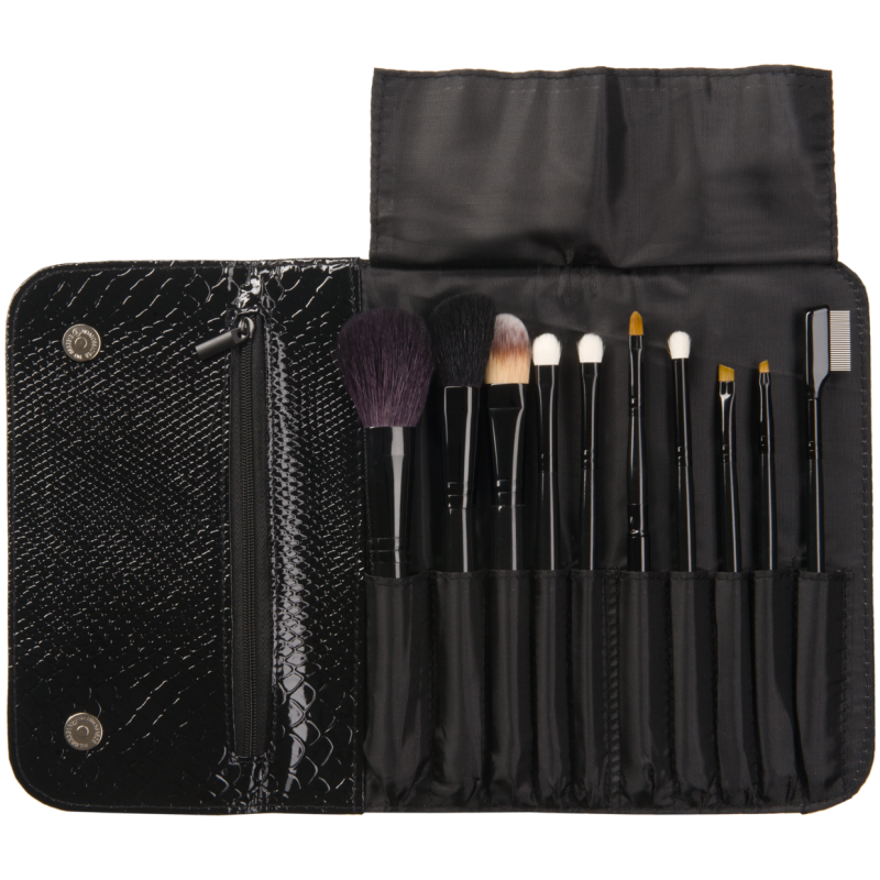 1) Большая плоская кисть для пудры и бронзера из премиум ворса козы. 2) Средняя плоская скошенная кисть для румян, для контуринга, сухих хайлайтеров и скульпторовиз премиум ворса козы. 3) Плоская кисть для тона, баз и любых кремовых текстур из нейлона. 4) Плоская кисть для растушевки теней и сухих текстур из премиум ворса козы. 5) Плоская уменьшенная кисть для растушевки теней и сухих текстур из премиум ворса козы. 6) Плоская складная кисть для губ с заостренным кончиком из нейлона. 7) Круглая кисть для растушевки теней среднего размера из премиум ворса козы. 8) Плоская скошенная кисть для подводки глаз и бровей из нейлона для подводки сухими и кремовыми средствами. 9) Плоская скошенная маленькая кисть для подводки глаз кремовыми и жидкими подводками из нейлона. 10) Кисть со стальными зубцами для идеального расчесывания накрашенных ресниц и бровей.